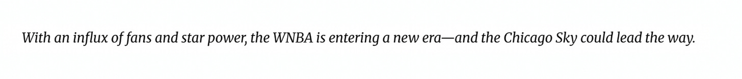 I was so thrilled that I wrote an article about it for South Side Weekly in Chicago. It was called “Welcome to the WNBA Hype Era,” and really, it was just a manifestation of the future I wanted to see (which is a thing I do sometimes.) Below the headline, the ‘deck’ literally read: